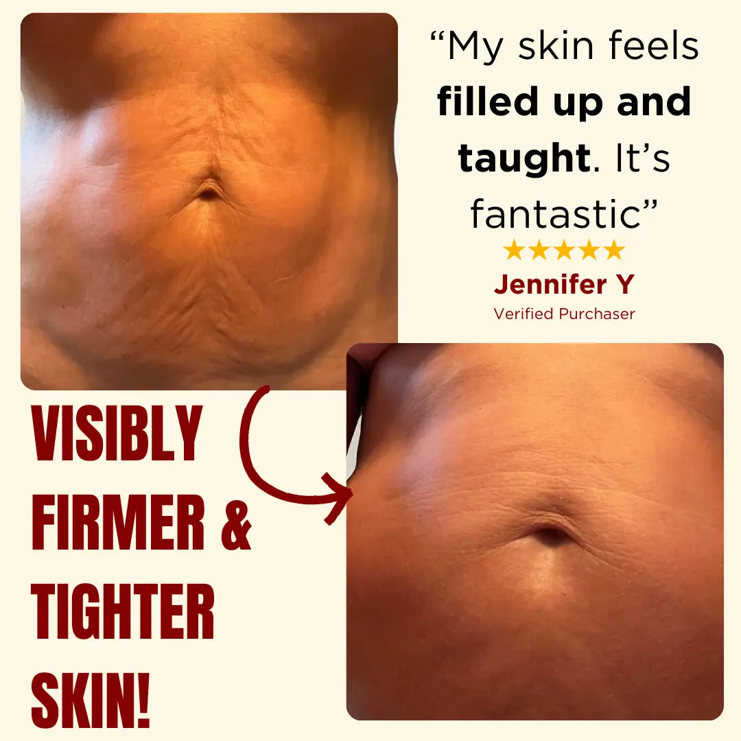 24 Weeks+: Firmer and tighter skin, loose skin begins to disappear and becomes plump. Natural collagen production is supercharged and your skin is getting healthier and more resilient day-by-day.